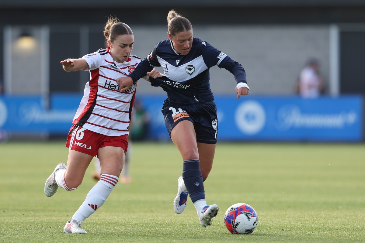 Pollicina holding off a pressing defender during Victory’s previous outing against Western Sydney Wanderers at The Home of the Matildas.